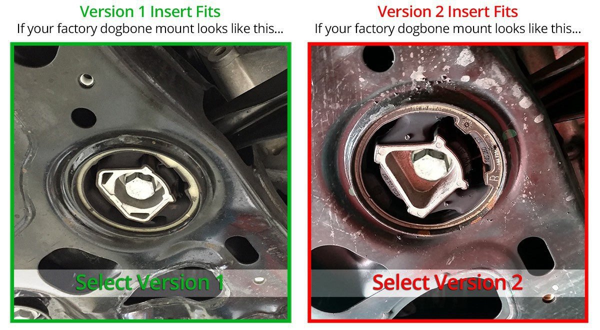 Please Note: Some Mk7 GTI & Golf R models are equipped with a different factory dogbone mount. To ensure fitment on your vehicle, please visually verify the mount you have using this guide, then select the Version 1 or Version 2 insert before adding the item to your cart.