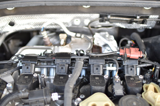 In order to confirm fitment and ensure that you order the correct version of our Coil Grounding Kit (CGK) you must disconnect your ignition coil connector from your coil pack. On the under side of the connector you will see a string of Characters below the VW/Audi stamped logos. The first three characters will be either 4D0 or 8K0. This will tell you which version of the kit you need for your vehicle. See image for further clarification.